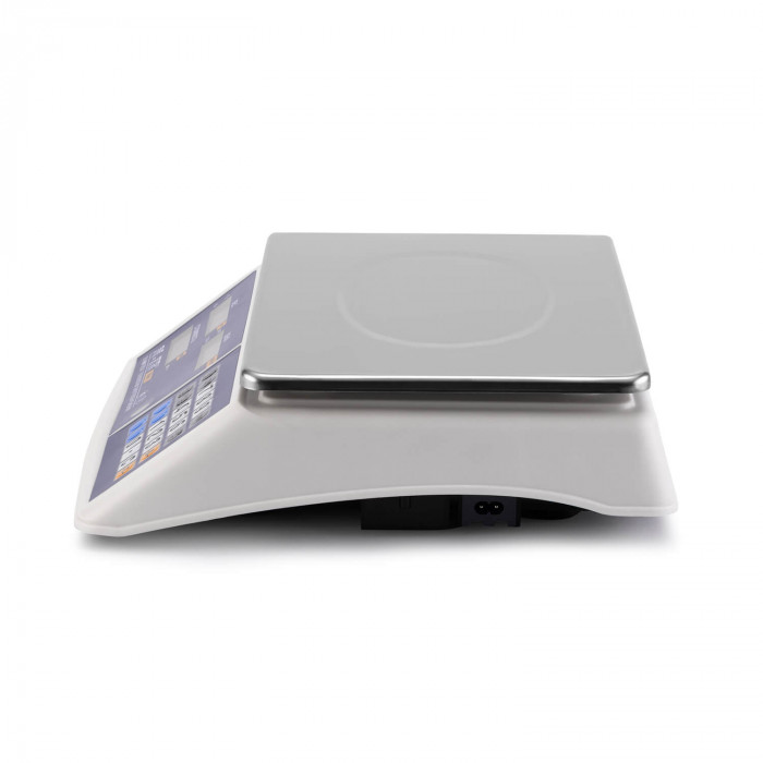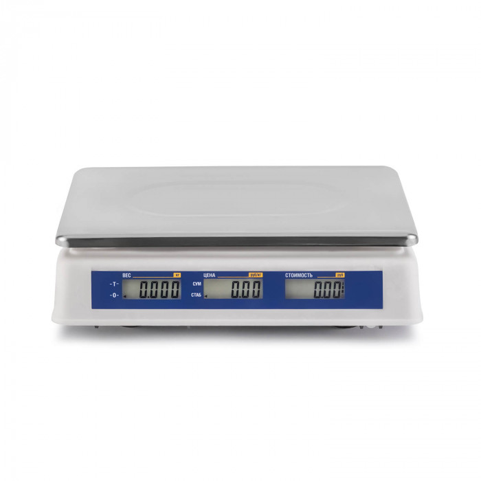 Со стороны покупателя и со стороны продавца установлено по 2 LCD экрана на 16 разрядов. Они показывают результаты измерений и расчетов: массу груза на платформе, стоимость 1 кг, общую стоимость покупки. Устройство не подключается к ПК.